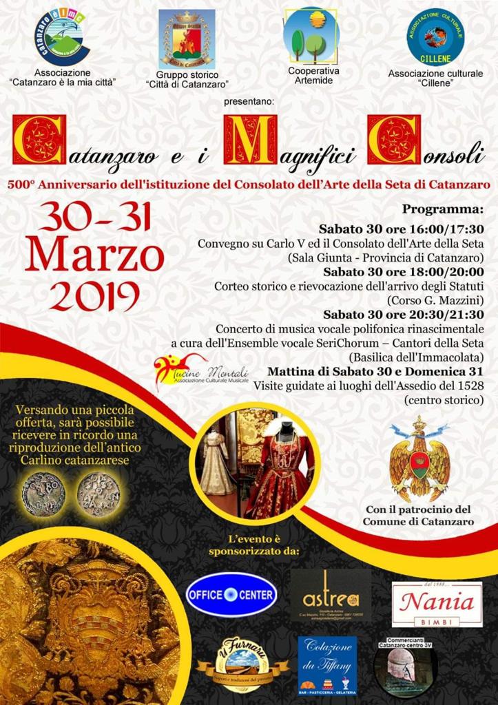 “Catanzaro e i magnifici consoli” avrà il suo clou il sabato 30 marzo: si partirà alle 16, nella sala consiliare della Provincia, con il convegno su Carlo V e il consolato dell’arte della seta; dalle 18, su corso Mazzini, si terrà il corteo storico e la rievocazione dell’arrivo degli statuti, mentre alle 20:30, nella Basilica dell’Immacolata, sarà il turno del concerto di musica vocale polifonica rinascimentale dell’Ensemble SeriChorum. Nelle mattinate di sabato 30 e domenica 31 si potrà partecipare alle visite guidate sui luoghi dell’assedio del 1528. “Sarà un evento unico nel genere, ricco di fascino e suggestione che porterà tutti noi indietro nel tempo”, hanno concluso Cardamone e Lobello.